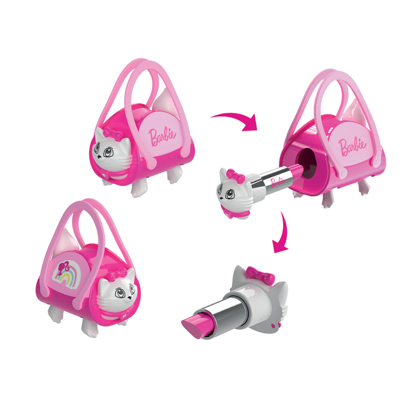 - Tube de rouge a levres Barbie.Rouge a levres bio (ingredients de source naturelle, sans danger et non toxiques) et ethique (100% garanti sans matiere d’origine animale et non teste sur les animaux).Double compatibilite : le tube de rouge a levres se presente sous la forme d’un sac de transport pour chat pouvant etre utilise comme accessoire de jeu avec une poupee (non incluse).2 coloris assortis